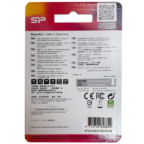 رابط این مدل فلش مموری از نوع USB 3.1 بوده و از رابط های قدیمی تر USB 1.1 , USB 2.0 و USB 3.0 هم پشتیبانی می کند, در نگاه اول این فلش مموری به سایر USBها شباهت بسیاری دارد با این تفاوت که طراحی جذابی بر روی بدنه آن به چشم میخورد. اما به محض این که نگاه دقیقتری به این محصول بیندازید متوجه میشوید که تمایز اصلی این فلش مموری در همین طراحی جذاب است، در واقع سیلیکون پاور در طراحی ظاهری این درایو از جوهر حرارتی استفاده کرده است که شرایط کاری آن را به شما نمایش میدهد. به طور دقیقتر، وقتی این فلش به سیستم متصل نیست یا در سیستم از آن استفاده نمیکنید، طرح روی بدنه فلش به رنگ آبی دیده میشود، اما وقتی از این فلش استفاده میکنید و آن را تحت فشار مداوم قرار میدهید، طرح روی بدنه فلش با افزایش دمای آن (به طور دقیقتر وقتی دمای آن به بیش از 31 درجه سانتیگراد میرسد) به تدریج به قرمز تغییر رنگ میدهد. البته شاید این ویژگی کاربرد خاصی نداشته باشد، اما بدون تردید در متمایز کردن Blaze B10 از سایر رقبایش کاملاً موفق بوده است.ضمنا در بدنه این فلش مموری یک نشانگر LED قرار دارد تا وضعیت انتقال اطلاعات و عملکرد فلش مموری را به شما نمایش دهد. قسمت بالا و پایین B10 اندکی مخروطی شکل بوده و یک حلقه در قسمت بالای آن تعبیه شده است که میتوان آن را به جا کلیدی آویزان کرد. در مجموع میتوان گفت در حالی که Blaze B10 یک محصول جذاب و متفاوت بوده، عملکرد قابل قبولی را هم ارائه داده است.