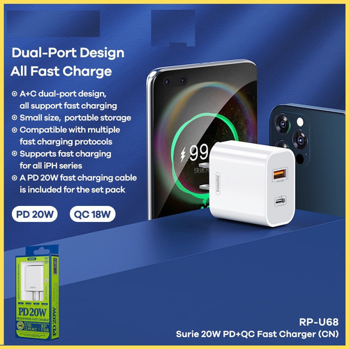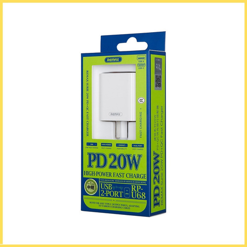 شارژر دیواری ریمکس مدل RP-U68 دارای PD و توان20 وات مناسب برای انواع دستگاه ها به خصوص آیفون 12/12pro/12pro max/13/13promax/13pro با وزنی سبک ,دارای ترانسفورماتور با کارایی بالا می باشد. این اداپتور دارای دو درگاه خروجی می باشد که یکی تایپ سی 20 وات و دیگری USB3 ـ18 وات می باشد و از فناوری PD و QC بهره میبرد که باعث شارژ سریع گوشی موبایل می شود.